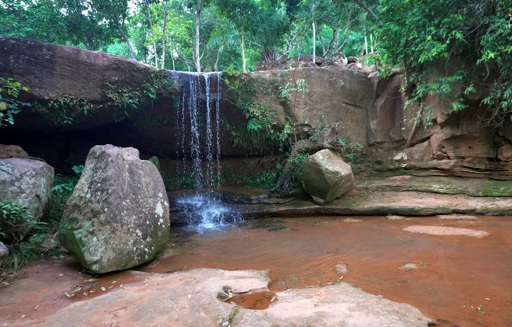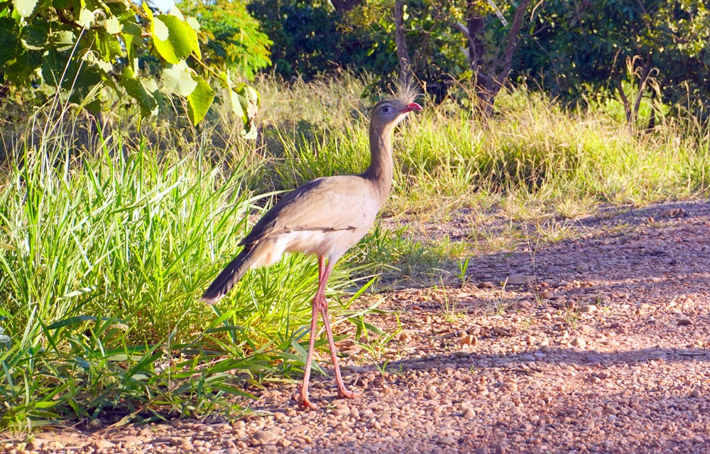 Lefelé menet megállunk a Paxixi-vízesésnél. Alig van benne víz, így nehezen értelmezhető természeti jelenség. A helyet egy út mentén gyalogló kígyászdaru menti meg, ami bambán bámul rám és a motorosomra.