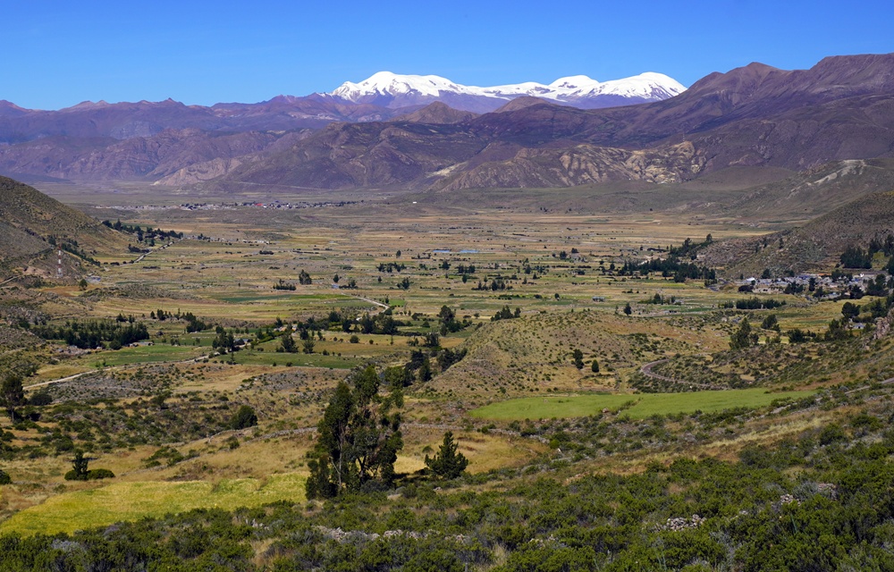 Orcopampából megindulunk felfelé, ahonnan zseniális kilátás nyílik a völgyre, valamint a háttérben a Nevado Coropunára.