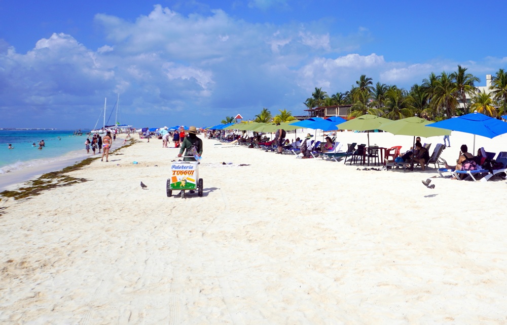 Azonnal a sziget legnagyobb strandjára, a Playa Centróra igyekszünk. Korán van, nincsenek sokan, tehát akár jó is lehetne, mégsem az, mert a parttól pár méterre már hínárszőnyeg borítja a tengerfeneket. A szomszédos Playa El Coral már jobb strand, de itt meg hatalmas a tömeg; a kihelyezett napozóágyaktól lépni is alig lehet. Isla Mujeres sétálóutcája sem valami káprázatos. A srácaim rádumálnak egy drága, de ehetetlen fagyira. 1800 forint egy gombóc színezett és habosított valami, amit nem is neveznék fagyinak.