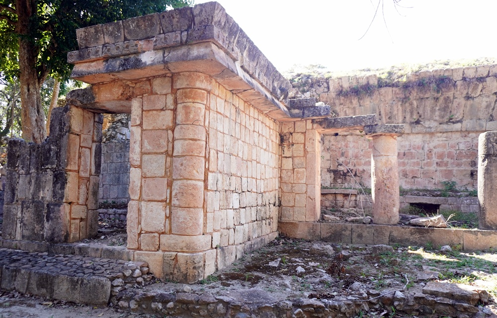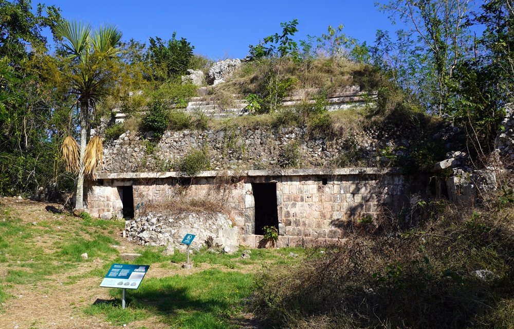 Eriék eddig jutnak, én pedig felmászom a Xetpol-csoport fellegvárába, ami elég elhagyatott pontja a régészeti parknak. Az ösvény tüskés bozóton át vezet a több szintes épületegyütteshez, aminek palotái ugyanúgy hatszobásak, mint a Cabalpak-csoport egyetlen rekonstruált épülete. Odabenn fecskék és más madarak fészkelnek, a padlót térdig érő guanó borítja. Ránézésre vagy egy évtizede nem takarították ki, nem tudom, meddig állnak még ezek az épületek.