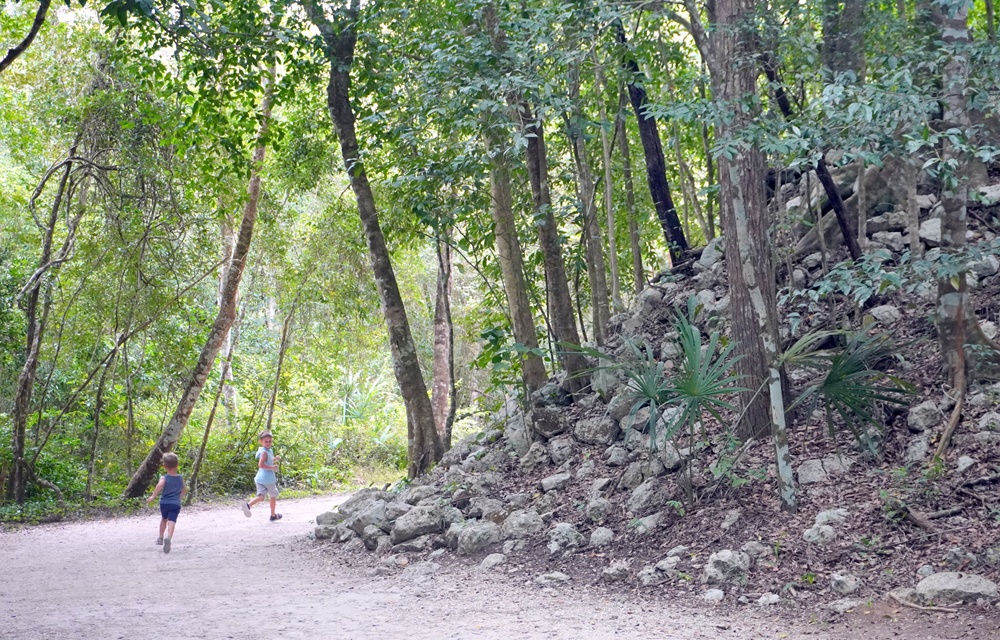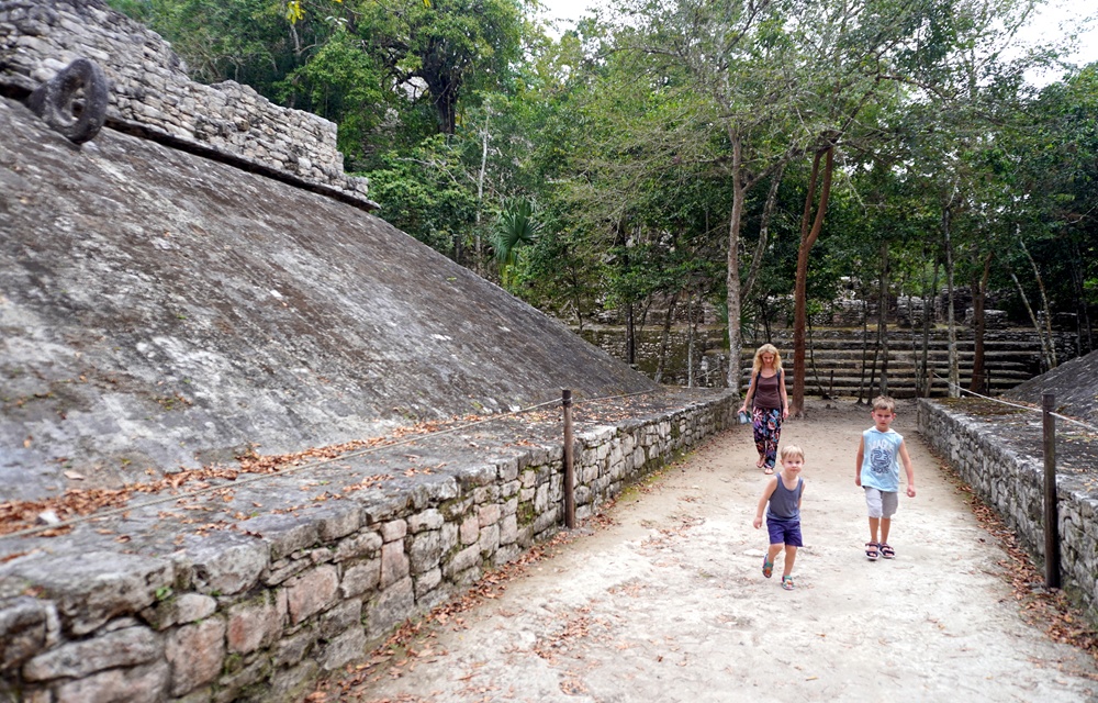 Cobá városkáját délután 3 óra után érjük el. Fizetni kell a parkolásért, van kötelező közösségi hozzájárulás valamint természetesen belépő is a romváros területére. Egyiknél sem szólnak, hogy el vagyunk késve, mert 4 órakor kiterelik az embereket a parkból, így kényelmes tempóban indulunk neki a romoknak abban a reményben, hogy az interneten látható 5 órás zárásig simán körbejárjuk. Barangónak vannak emlékei a két évvel ezelőtti yucatáni kalandjainkról, de Zarándnak nincsenek, így próbálom neki elmagyarázni, mit is csinálunk itt pontosan, de egy a napokban negyedik életévét betöltő aprónépnek még érdekesebbek a faágak és kavicsok, mint a maja istenek és uralkodók. Ebből kifolyólag elég lassú tempót megyünk.