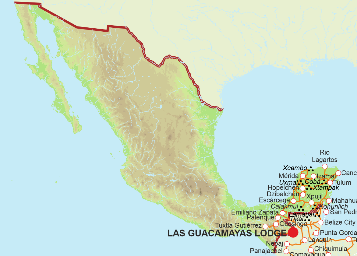 Az út errefelé már kevésbé látványos, El Ixcán után - ahol szó szerint érintjük a határt - kifejezetten unalmassá válik. Egy katonai ellenőrzőpontnál kanyarodunk le a főútról és indulunk meg északnak Lacandónia, vagyis a lakandón maják falvai mentén. A környék lakói többnyire marhatenyésztésből és kukoricatermesztésből élnek, népviseletet errefelé már senkin nem látunk. Sorban átkelünk Boca de Chajul, Lacantún, Galacia és López Mateos településein mielőtt megérkeznénk a Rio Lacantún partján fekvő Reforma Agrariába, aminek határában áll a Las Guacamayas Ecolodge. Nincs foglalásunk, de nem is nagyon kell, mert a szálló teljesen üres. Nem olcsó itt megszállni, illetve nem illeszkedik a budget-ünkbe, de a jövőbeni Mirador-túrák okán kénytelen vagyok áldozni rá.