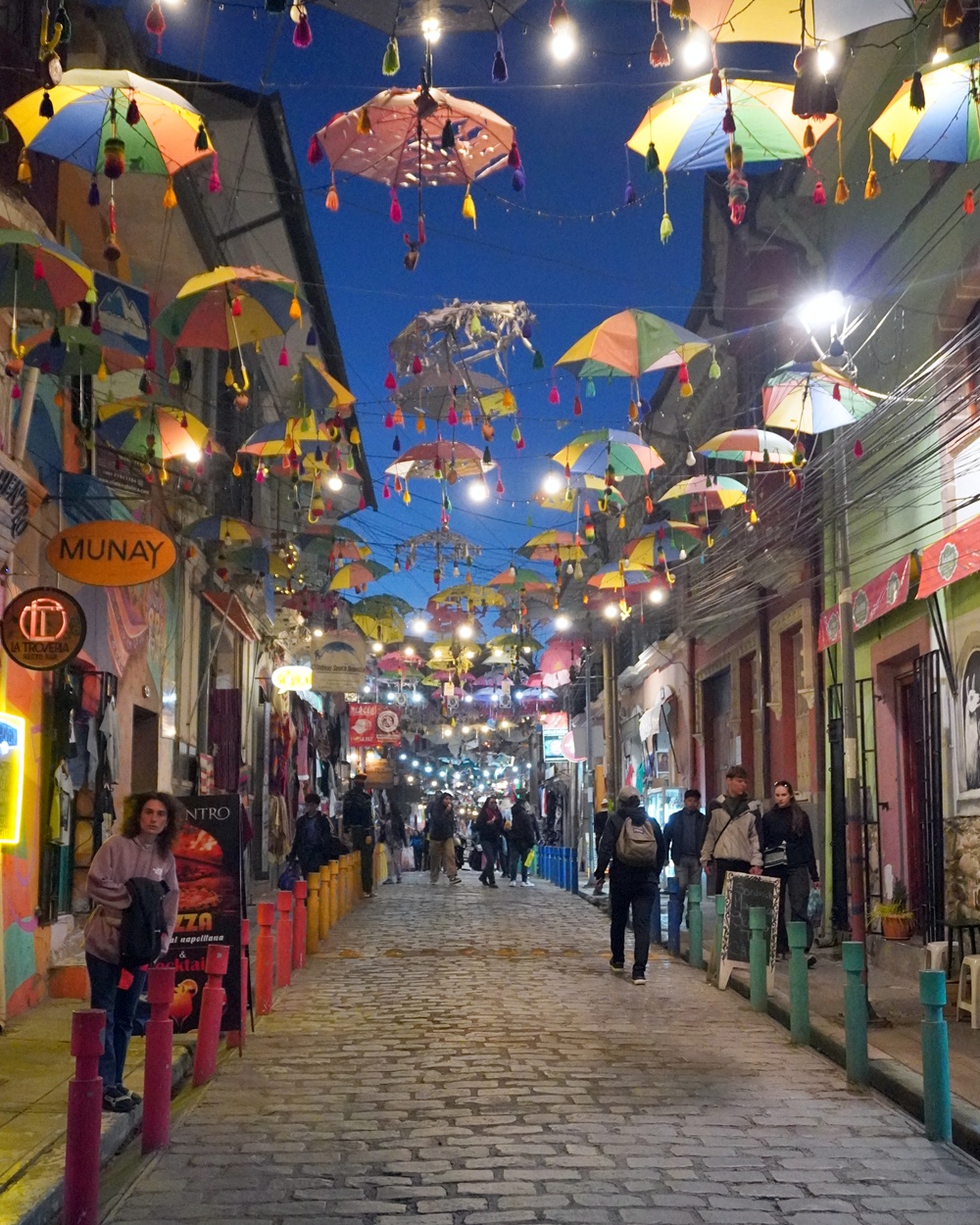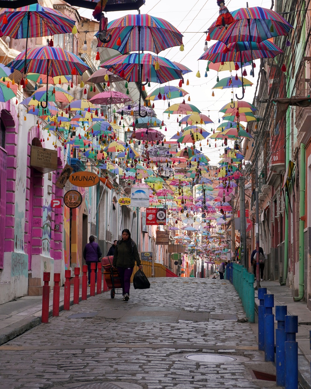 Az óváros lepukkant utcáit La Pazban is a legolcsóbb módszerrel tették izgalmassá. Ennyi esernyő sehol a világon nincsen!