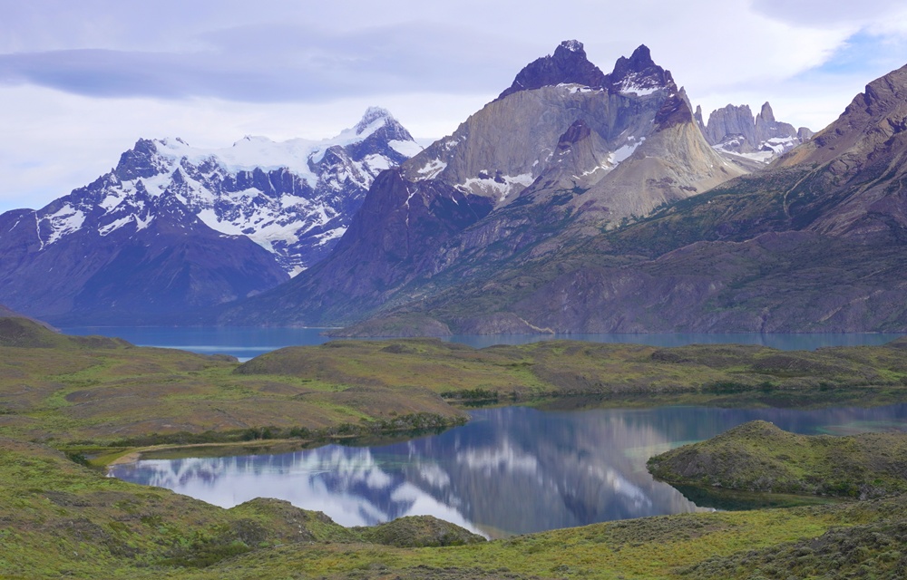 A pudetói kikötő felé haladva feltűnnek a nemzeti park ikonikus gránittömbjei. A tükröződés miatt tudjuk, hatalmas mázlink van, mivel teljes a szélcsend a Nordenskjöld-tó partján.
