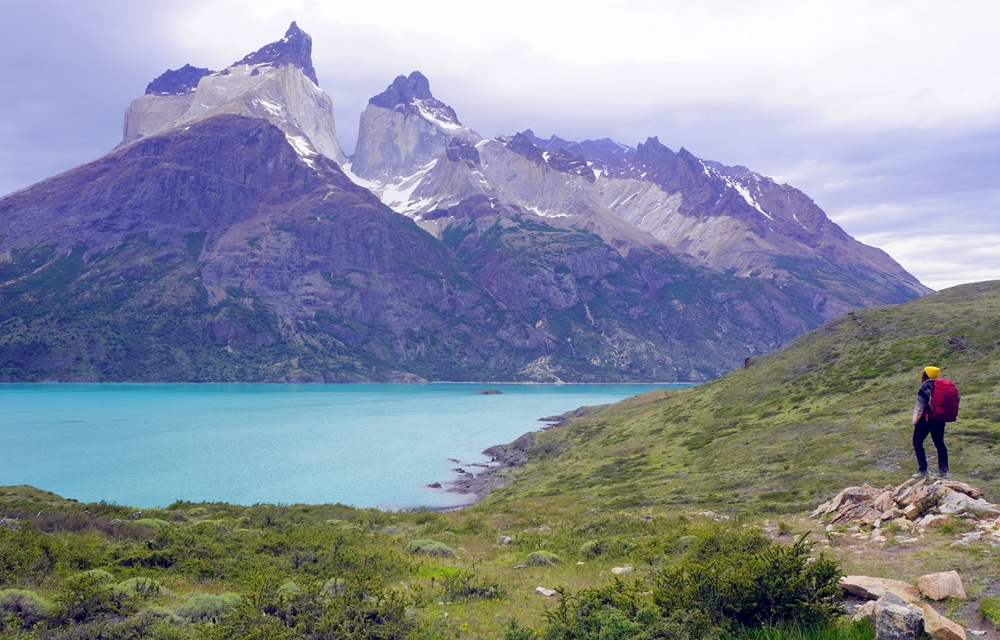 Az ösvényről fantasztikus a kilátás a Nordenskjöld-tóra. Előtérben a Los Cuernos menedékház látható.