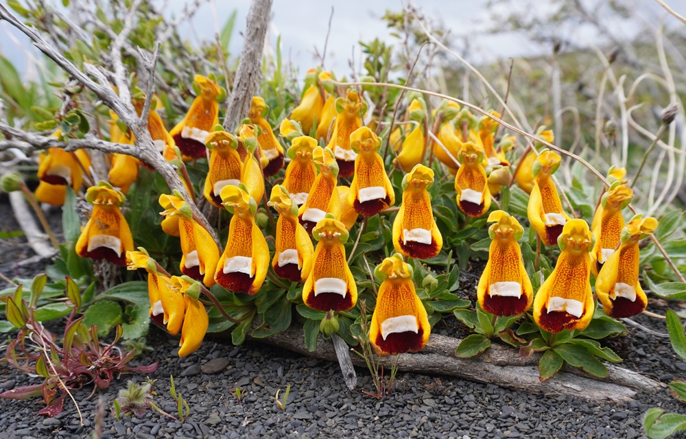 Azért szeretek tavasz végén Patagóniában túrázni, mert ilyenkor virágba borulnak a mezők. A Torres del Paine egyik ikonikus növénye a Darwin papucsa, amik távolról rikítanak.
