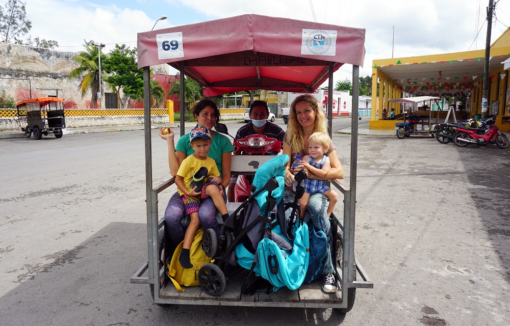 A romokat legkönnyebben az agglomerációhoz tartozó Chablekalból lehet elérni, oda azonban nem indul busz minden percben. Majdnem egy órán át ácsorgunk a tűzőnapon a sorban a Calle 56-on kialakított megállóban. Olyan szakadt busz jön, amihez hasonló csotrogányokat korábban csak Venezuelában láttunk.