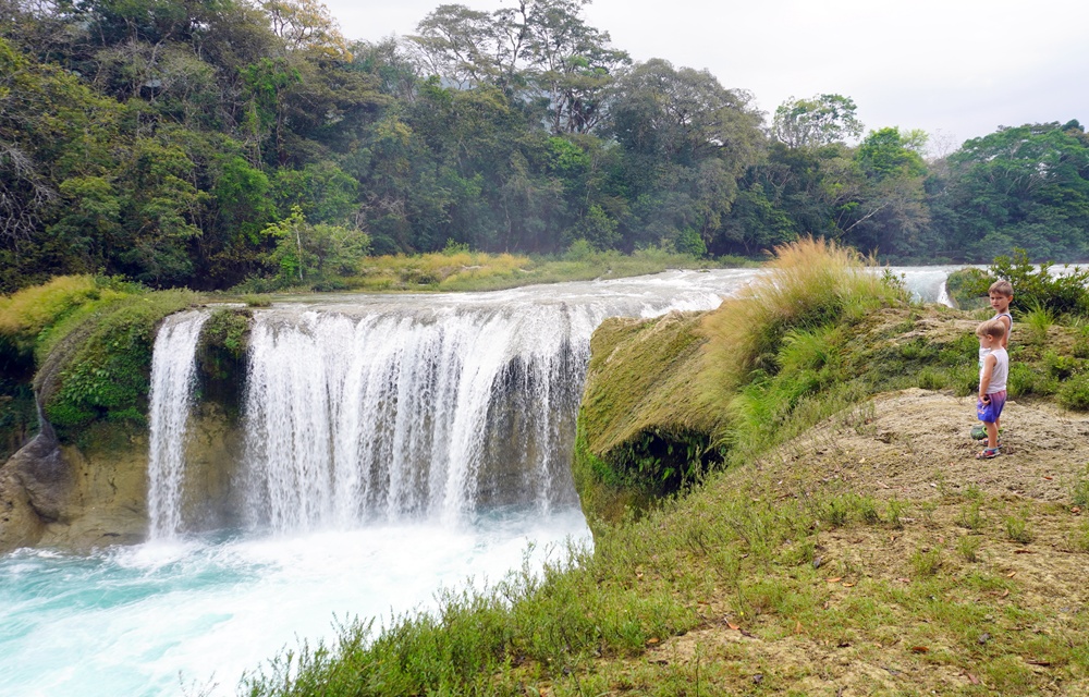 Az ökoparkot kocsival érjük el. A belépő nem sok, mindössze 40 peso fejenként. Leparkolunk, majd az amúgy eléggé elhanyagolt lodzson keresztül sétálunk le a vízesésekhez. Semmiféle kerítés nincs, így egészen a leszakadásig lehet sétálni, ami egyrészt tök oké, másrészt kicsit kalandos két pici gyerekkel. Zaránd még csak a napokban töltötte be a 4. életévét, nem kiszámítható még a mozgása és a félelemérzete sem ott van, ahol a miénk.