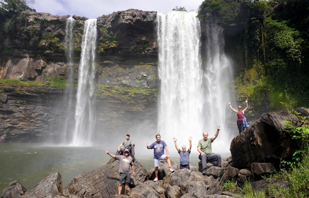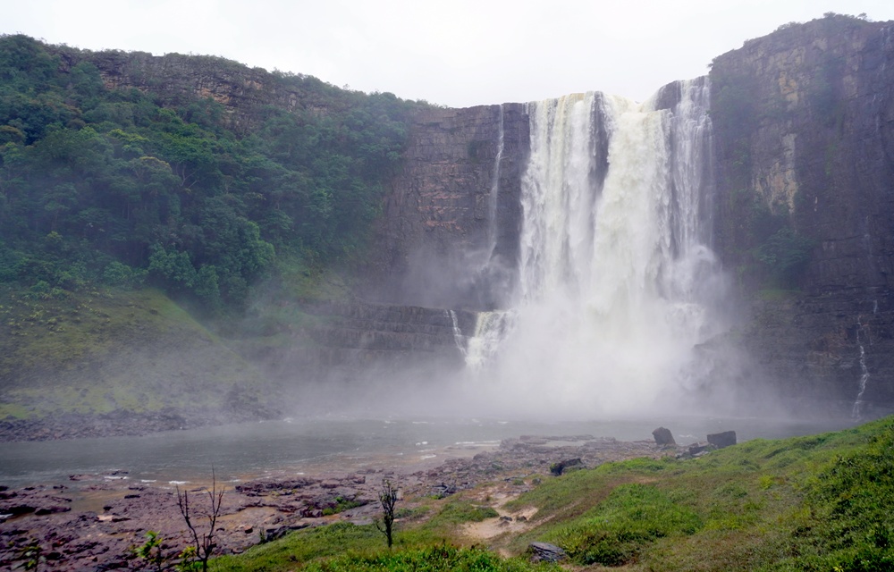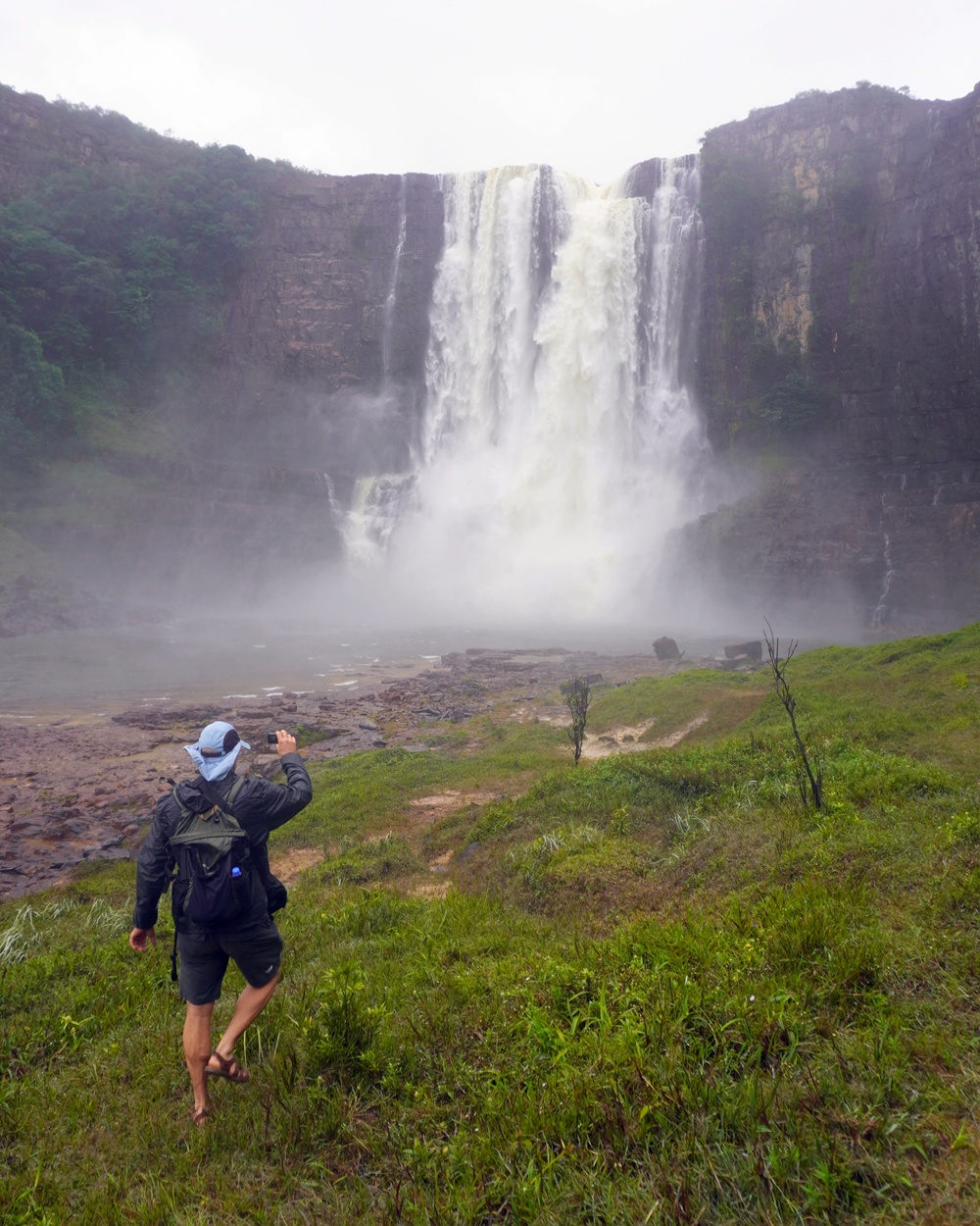 Reggel átkelünk egy csónakkal a folyón, majd fél órás séta következik az Aponwao-vízesés lábához. A 105 méter magas zuhatag egészen elképesztő. Olyan erővel szakad alá az éjszakai esőt követően, hogy képtelenek vagyunk megközelíteni. A vízpermet kétszáz méterrel odébb is eláztat minket, alig tudunk fényképezni.