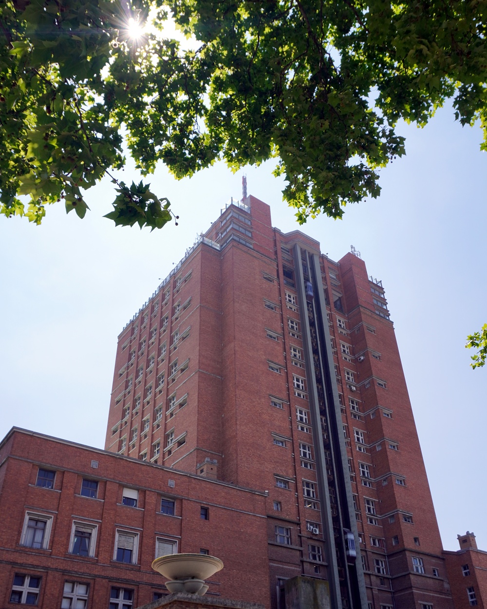 Először a polgármesteri hivatalhoz sétálunk el, ami egy ronda toronyépület tőlünk néhány sarokra. Sokan nem tudják, de az épület tetejére fel lehet liftezni, ahonnan meglepően jó a kilátás a városra, ráadásul teljesen ingyenes. Az eső miatt nem sikerül jó képeket lőnünk, de én voltam itt fenn már korábban, jó időben, úgyhogy személy szerint nincs hiányérzetem.